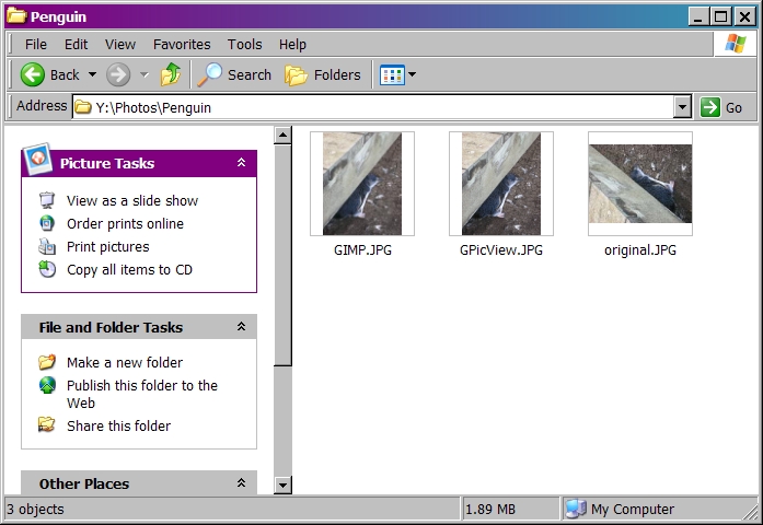 Created attachment 2334 Screenshot of windows XP These are the thumbnails of same files in the same folder, but as viewed in windows XP. The GPicView.jpg thumbnail is presented in the portrait orientation that was set in the EXIF of the file.