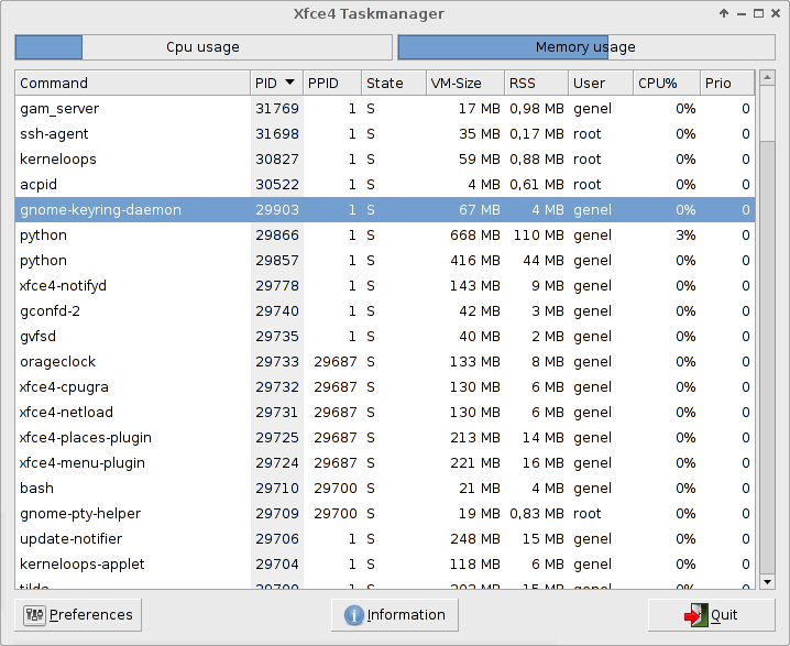 Created attachment 2340 screenhot showing unnamed python processes and false CPU% issue #1 --- all python processes are displayed as "python", not with their own names.(in screenshot: you can see two "python" entries, they should have been "quodlibet" and "medit", as shown by top) issue #2 --- in xfce4-taskmanager, most processes are displayed as using much less CPU than top command does. Sometimes a process gets a few percents then they drop off. of course top command says the opposite. (in screenshot: the quodlibet "python" entry says %0-%3, top says %8-%14 consistently). this is true with any process, all the time. versions: continues since from 4.4 times till now 4.6.1 my setup: debian testing with linux 2.6.26-2-amd64. recently i deleted all xfce files from ~/ because of the rodent icon theme issue when upgrading from 4.4 to 4.6, so ~/ files can't be the problem.