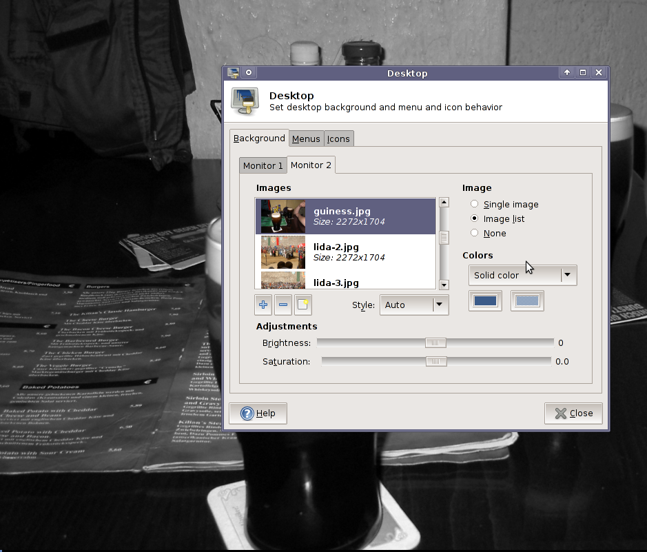 Created attachment 2343 Screen shot demonstrating that wallpaper is not black&white I have two displays in a system and after some change wallpaper on second display started to appear as grayscale. izapolsky@luke:~$ xprop _NET_FRAME_EXTENTS(CARDINAL) = 0, 0, 0, 0 _NET_WM_ALLOWED_ACTIONS(ATOM) = _NET_WM_ACTION_CLOSE, _NET_WM_ACTION_ABOVE, _NET_WM_ACTION_BELOW, _NET_WM_ACTION_FULLSCREEN WM_STATE(WM_STATE): window state: Normal icon window: 0x0 _NET_WM_DESKTOP(CARDINAL) = 4294967295 _WIN_WORKSPACE(CARDINAL) = 0 _WIN_STATE(CARDINAL) = 1 _NET_WM_STATE(ATOM) = _NET_WM_STATE_STICKY, _NET_WM_STATE_SKIP_PAGER, _NET_WM_STATE_SKIP_TASKBAR _WIN_LAYER(CARDINAL) = 0 WM_HINTS(WM_HINTS): Client accepts input or input focus: True Initial state is Normal State. window id # of group leader: 0x1600001 XdndAware(ATOM) = BITMAP _MOTIF_DRAG_RECEIVER_INFO(_MOTIF_DRAG_RECEIVER_INFO) = 0x6c, 0x0, 0x5, 0x0, 0x0, 0x0, 0x0, 0x0, 0x0, 0x0, 0x0, 0x0, 0x10, 0x0, 0x0, 0x0 _NET_WM_SYNC_REQUEST_COUNTER(CARDINAL) = 23068677 _NET_WM_WINDOW_TYPE(ATOM) = _NET_WM_WINDOW_TYPE_DESKTOP _NET_WM_USER_TIME_WINDOW(WINDOW): window id # 0x1600004 WM_CLIENT_LEADER(WINDOW): window id # 0x1600001 _NET_WM_PID(CARDINAL) = 7787 WM_LOCALE_NAME(STRING) = "en_IE.UTF-8" WM_CLIENT_MACHINE(STRING) = "luke" WM_NORMAL_HINTS(WM_SIZE_HINTS): program specified location: 0, 0 program specified minimum size: 2560 by 1024 window gravity: NorthWest WM_PROTOCOLS(ATOM): protocols WM_DELETE_WINDOW, WM_TAKE_FOCUS, _NET_WM_PING, _NET_WM_SYNC_REQUEST WM_CLASS(STRING) = "xfdesktop", "Xfdesktop" WM_ICON_NAME(STRING) = "Desktop" _NET_WM_ICON_NAME(UTF8_STRING) = 0x44, 0x65, 0x73, 0x6b, 0x74, 0x6f, 0x70 WM_NAME(STRING) = "Desktop" _NET_WM_NAME(UTF8_STRING) = 0x44, 0x65, 0x73, 0x6b, 0x74, 0x6f, 0x70 izapolsky@luke:~$ xfdesktop --version This is xfdesktop version 4.6.1, running on Xfce 4.6.1. Built with GTK+ 2.14.4, linked with GTK+ 2.14.4. Build options: Desktop Menu: enabled Desktop Icons: enabled Desktop File Icons: enabled izapolsky@luke:~$