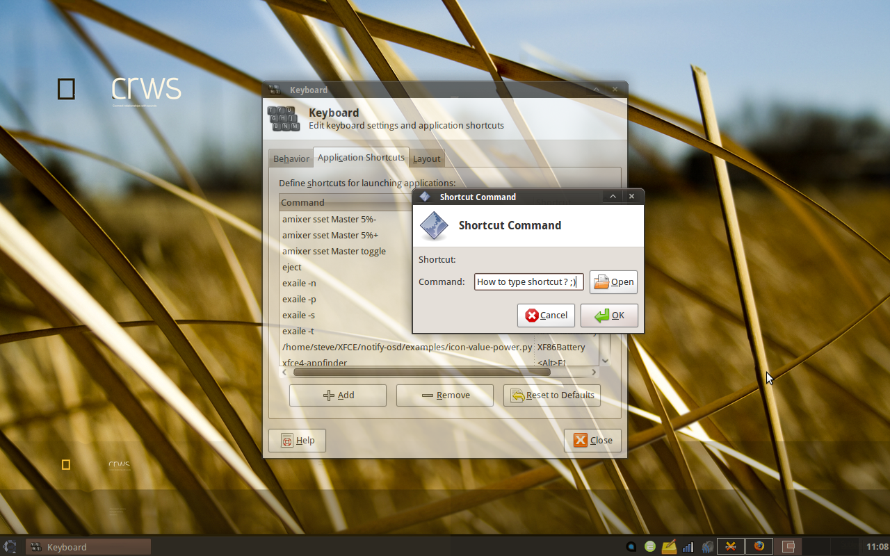 Created attachment 2378 Screenshot of the problem Hello people, I'm adding this bug report because of what I consider a serious usability issue in the 'add keyboard shortcut' dialogs. I noticed that a few people on #xubuntu and #xfce asked for help because they thought they could not add keyboard shortcuts, because they could only type the command and not the shortcut. This is due to the way the first window (the one in which you add the command) is presented (see attachment 1 ). They think the second dialog is a "Done, click Ok without reading" dialog, or they dont even go past the first one because they don't understand why the "Shortcut:" part is "greyed out". Instead of the current state (an empty "Shortcut:" text field), I propose the following : The first window only contains "Command:", and possibly a notice in the bottom of the window, saying : "You can set the shortcut for this command on the next window". Another way to make it easier would be to have the Command: and Shortcut: on separate windows, and to add a "First time" dialog (track this with xfconf ?) explaining the user that (s)he'll be asked the command first and the shortcut next. Cordially, SD. PS : i'm setting the severity to Major as I think it is indeed a major usability issue. Change it if you think it's wrong :P