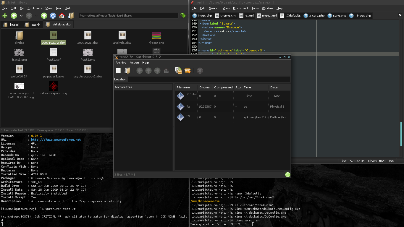 So I'm trying to figure out anything else useful. I reinstalled glibc (that's the only thing I could think of about that error mentioned above) and xarchiver, ran ldconfig, tried gdb again to find any errors. Still hasn't worked o.O Any other type of archive works (i assume so. Only 7z has been causing a problem now...). So far the closest I have been able to open a 7z archive in the actual GUI results in something like what's in that screenshot...