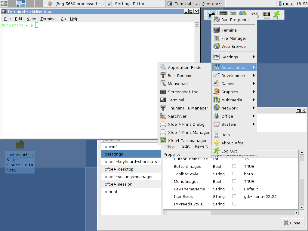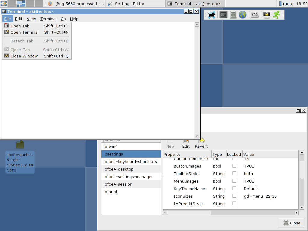 I've tried this with a newly created account (for elimination of trash in user settings) -- the same. I'm a Gentoo user. I've tried both ebuilds: libxfcegui4-4.6.1 (stable) and libxfcegui4-4.6.1-r1 (unstable) -- the same I'm not sure if I know how can I install it from the sources you linked without destruction of packages installed into my Gentoo. I'd appreciate any *overlay*, new "unofficial" ebuild, some tips for existing ebuild modification or more detailed instructions for it. Thanks in advance
