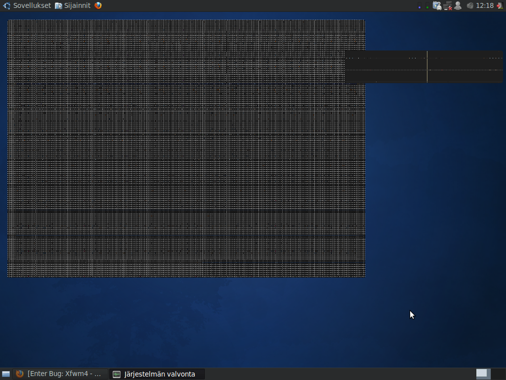 Created attachment 2646 The big window is System Monitor (Järjestelmän hallinta) and the little one on right is Network Manager Applet. Every time I start System Monitor (Järjestelmän valvonta), the whole window is a huge graphical mess. Same happens for Network Manager Applet when it displays something when I plug ethernet cable in and out. They seem to work fine, but since I can't see what's happening, it's kind of pointless. I'm using a fresh install of Xubuntu 9.10. My computer is IBM ThinPad T30, here's some specifications: http://www-307.ibm.com/pc/support/site.wss/MIGR-58227.html.