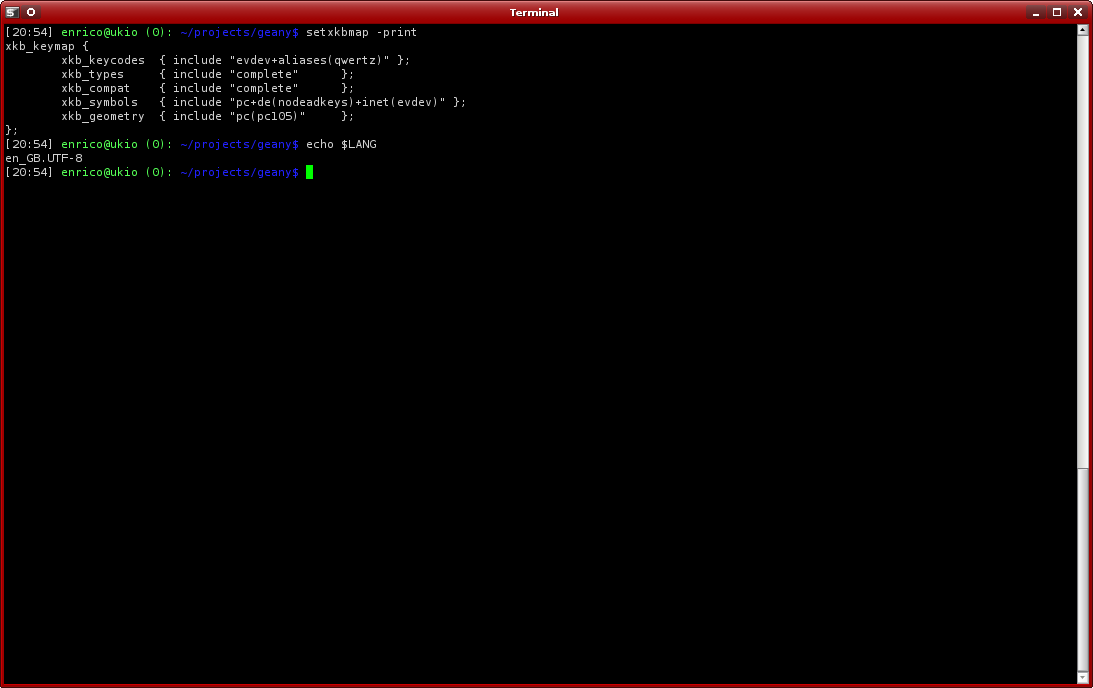 i have a german keyboard and set up xorg accordingly (details further down). when i enter diacritics ä/ae, ö/oe, ü/ue or ß/ss terminal prints "?" (a question mark) instead. in contrast both gnome-terminal and yakuake/konsole print diacritics as expected. details about my setup: - Xfce keyboard settings: Use system defauls - Linux kernel: 2.6.31 - xorg version: 1.6.5 # setxkbmap -print xkb_keymap { xkb_keycodes { include "evdev+aliases(qwertz)" }; xkb_types { include "complete" }; xkb_compat { include "complete" }; xkb_symbols { include "pc+de(nodeadkeys)+inet(evdev)" }; xkb_geometry { include "pc(pc104)" }; }; please let me know what i can do to help you track that down.
