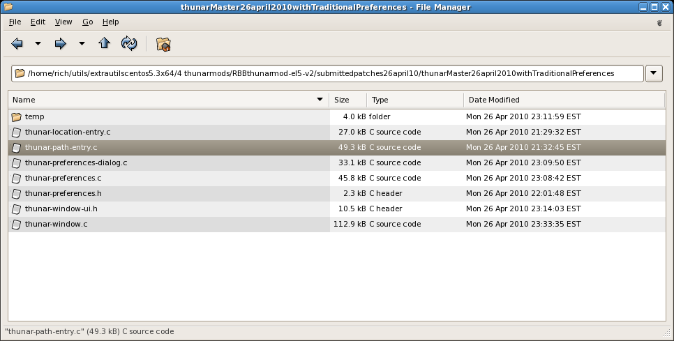 I have updated the Thunar Traditional Preferences patch to work with Thunar 1.3.0 (thunarPreferencesTraditionalPatch-1.3.0EL6.patch). I have uploaded the corresponding patched source code (Thunar-1.3.0-withwithBugzillaEnhancement6412TraditionalPreferences.tar.bz2), along with the compiled RPM for EL6 (Thunar-1.3.0-4.el6.x86_64-withwithBugzillaEnhancement6412TraditionalPreferences.rpm). This latest patch was built using Thunar-1.3.0-4.el6.src.rpm. NB thunarPreferencesTraditionalPatch-Master26april2010.patch was likely broken (based upon compatibility issues between Thunar versions). The Thunar Traditional Preferences patch for Thunar 0.9.0 appears fine (thunarPreferencesTraditionalPatch-0.9.0EL5.patch). See also its corresponding source code ( Thunar-1.3.0-withwithBugzillaEnhancement6412TraditionalPreferences.tar.bz2) and rpm (Thunar-0.9.0-2.x86_64-withwithBugzillaEnhancement6412TraditionalPreferences.rpm). Cheers, Richard