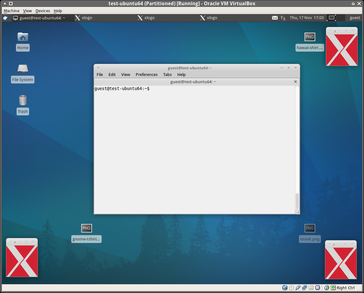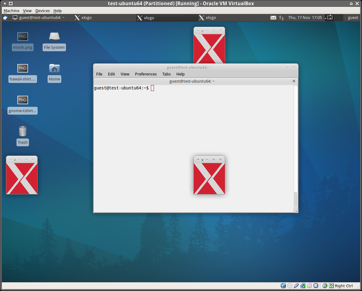 Created attachment 3967 Screenshot: Before game This is a screenshot of a stock Xubuntu 11.10 desktop, with Xfce 4.8, running inside VirtualBox. I've set up three windows, and three desktop icons at the bottom and right-side corners of the screen. There is also a terminal window occupying the center area.