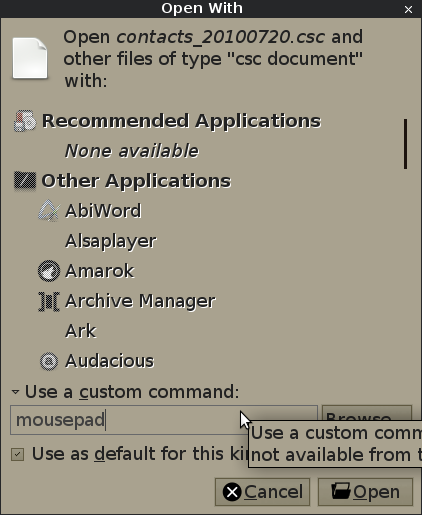 Created attachment 3362 an illustrative screnshot It would be useful if there was tab completion like in the terminal when user chooses "Open With Other Application" > "Use a custom command". For example, I print there "mou" and then press Tab to get "mount-mountpoint-mousepad" successively. So adding a command (especially one not in list) would become much handier.