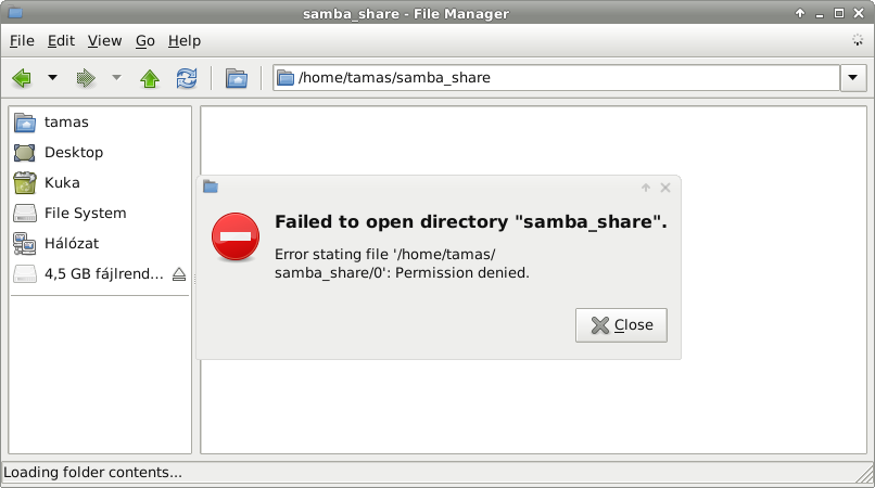Created attachment 3407 thunar can't open an usmb mounted dir If I mount a samba share with usmb and the share contains a dir with no read permission for me, thunar can't open it. To reproduce, I created a directory under my home as root with read permission only for the owner, it's name: 0 Created a samba share for my home, it's name: home Created a directory where I will mount the share, it's name: samba_share Created ~/.usmb.conf --------------- <usmbconfig> <credentials id="cred1"> <domain></domain> <username>tamas</username> <password></password> </credentials> <mount id="home" credentials="cred1"> <server>127.0.0.1</server> <share>home</share> <mountpoint>/home/tamas/samba_share</mountpoint> </mount> </usmbconfig> --------------- Mounted it: usmb home