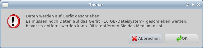 When unmounting a removable media using Thunar or places-plugin, a popup comes up to tell me that there is some data to be written before I can safely remove the media. This popup window has an ok and a cancel button, but both are only closing the popup. You can't stop unmounting or cd ejection by clicking cancel, so I think the cancel button shouldn't be there at all.