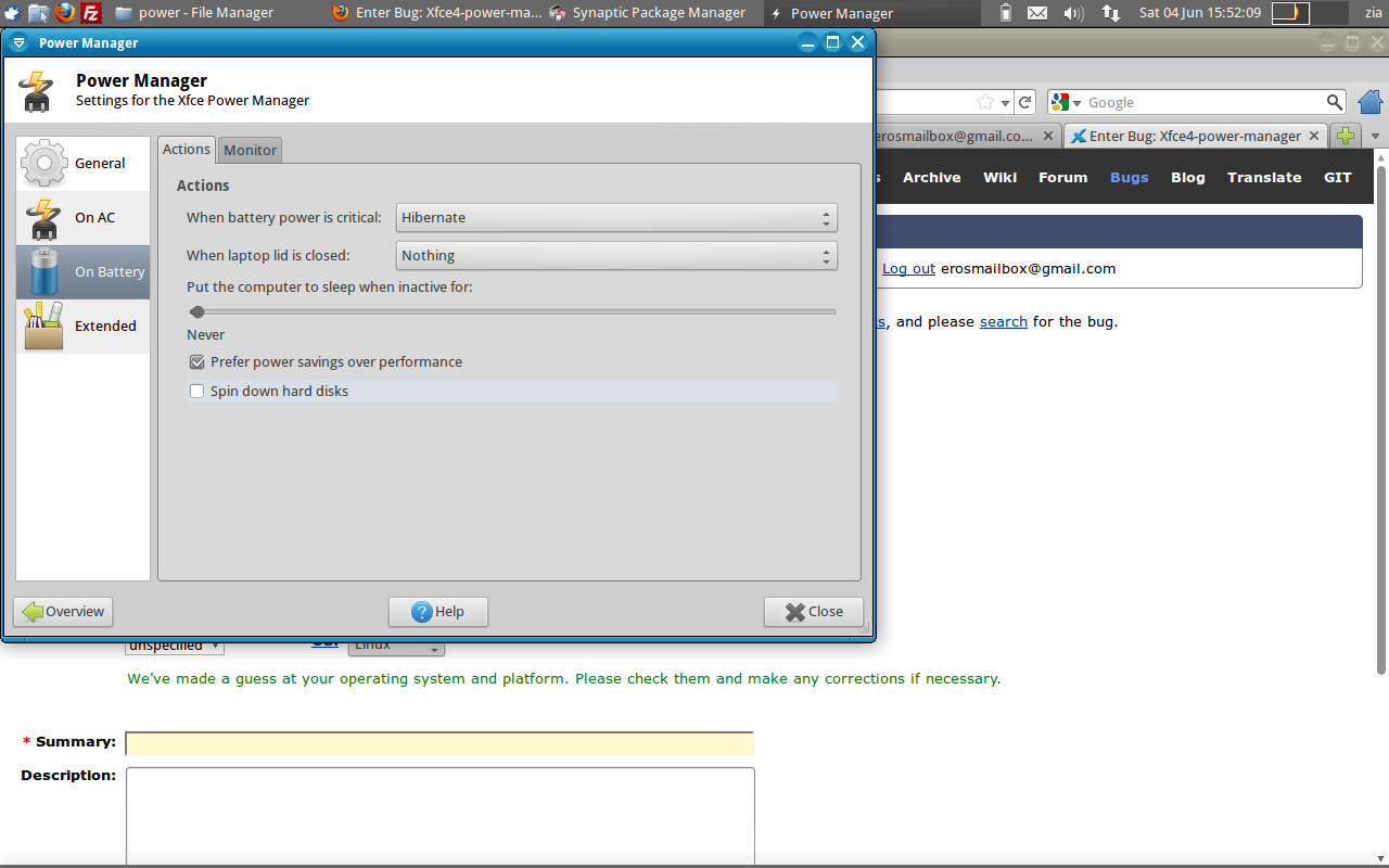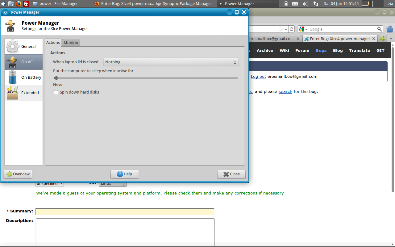 (In reply to comment #6) > Also http://goodies.xfce.org/projects/applications/xfce4-power-manager offer > version 1.0.10. Yes, the correct version is 1.0.10, i was wrong. can you try to close the power manager: xfce4-power-manager -q then delete its configuration file: rm $HOME/.config/xfce4/xfconf/xfce-perchannel-xml/xfce4-power-manager.xml the launch the power manager with: xfce4-power-manager --debug And then open the configuration dialog, check the "spin down on AC", then uncheck it and attach me the output of the power manager from the terminal. (Also run 'whereis xfce4-power-manager-settings' and attach me the output here)