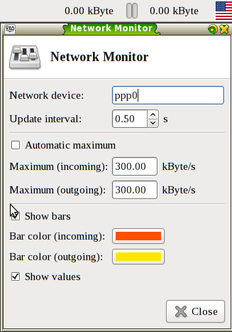 Problems: * It does not show the label anymore, even when unselecting "Show values". What if you got two interfaces (eth0, wlan0)? * The values are already shown in the tooltip. > Patch works fine, but it takes a lot of space in the panel. Suggestions: * Make unit names shorter (kByte => kiB). * Use smaller horizontal spaces. * Similar to the panel date and time plugin, make the font a little bit smaller. Then put both values on the right side of the bars and on top of each other, like this (it's a bit hard to do in ASCII, but I think you'll get the idea): [ ] || [ D: 0.0kiB ] [eth0] || [ ] [ ] || [ U: 0.0kiB ] * Another idea: Use colors for down and up, like those for the bars.