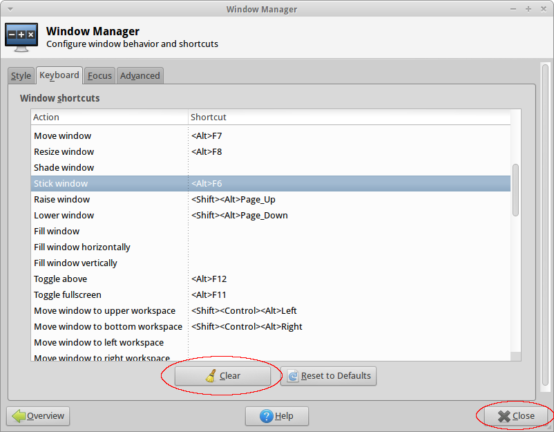 Created attachment 4012 Screenshot of bug Using Xubuntu 11.10 with xfwm4-settings --version being 4.8.2 1. Open xfwm4-settings 2. Click Keyboard tab 3. Hold alt Hitting alt+C closes the window. There's no hotkey for the "Clear" button, even though it shows it as alt+C.