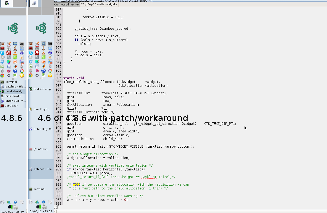 Created attachment 4084 Screenshots of the version 4.8.6 and 4.8.6 with the workaround/patch Hi I'm using xfce4-panel 4.8.6-1 within xfce4.8.0.3 on debian wheezy. I'm surprised to see that the buttons of the tasklist are all of the same height when the panel is used vertically. In previous versions (4.6 and below) the buttons were spreading over the entire height of the tasklist. I enclose one picture made of two screenshots to illustrate the two situations side by side. I personally would like to have the choice between the two options (fixed height, spreading over the whole area), and even better, being able to set the maximum height/minimum height of the button. I believe this problem is known by the developers because by using some part of the code from xfce4-panel-4.9 I manage to make the panel behave the way I wanted. I'm enclosing my "workaround" in the form of a patch file, but it is not a proper patch as it breaks the behavior when the panel is horizontal. I thought I could share this workaround here for those who were in the same situation than me, and express the need for this functionality in further releases.