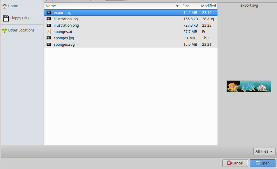 Created attachment 7914 Shows SVG file sizes when opening a directory The bug exists. Linux panther 4.8.4-040804-generic #201610220733 SMP Sat Oct 22 11:35:18 UTC 2016 x86_64 x86_64 x86_64 GNU/Linux Ubuntu 16.04.5 LTS \n \l Replicate 1. Create two or three large SVG files (at least 15 MB) in a single directory 2. Start Firefox 3. Visit a web site with the ability to upload a file (e.g., https://bugzilla.xfce.org/attachment.cgi ...) 4. Click Browse... 5. Set the directory to the location with large SVG files Expected Results The directory opens instantly, having ignored attempting to render thumbnails of any files greater than a certain amount, or total file sizes exceeding a certain amount. (For example, maybe the limit is "don't read more than 1 MB" for thumbnails. The limit should be user-configurable.) Actual Results The application tries to render two or three 15 MB SVG files, which takes a long time on a fast computer. It would be painfully slow on older hardware. Work Around None. Suffer through waiting, which also locks up the application used to open a file.