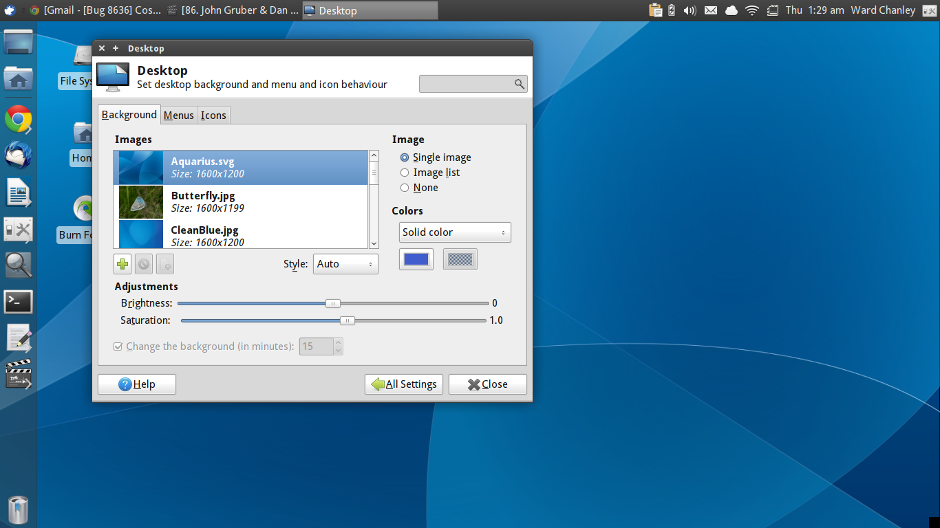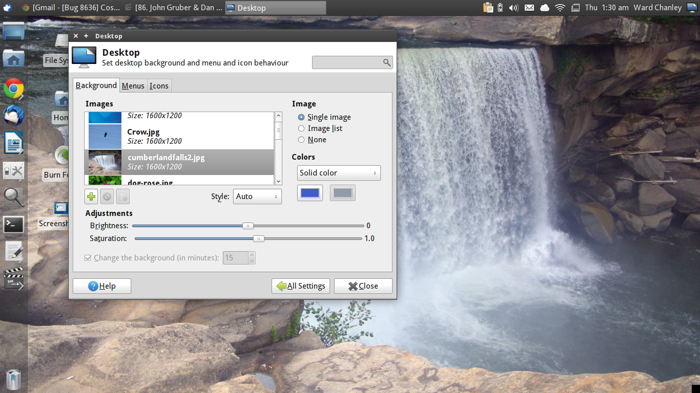 Thanks - here's what I'm getting from xrandr: --- Screen 0: minimum 320 x 200, current 1366 x 768, maximum 8192 x 8192 LVDS1 connected 1366x768+0+0 (normal left inverted right x axis y axis) 344mm x 194mm 1366x768 60.0*+ 1360x768 59.8 60.0 1024x768 60.0 800x600 60.3 56.2 640x480 59.9 VGA1 disconnected (normal left inverted right x axis y axis) HDMI1 disconnected (normal left inverted right x axis y axis) DP1 disconnected (normal left inverted right x axis y axis) --- Yes, I'm getting this with any wallpaper (I'll post a couple of additional screenshots).