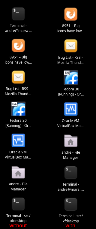 I have xfdesktop configured to display minimized application icons. When the icon size is set to 32 px icons show fine. When a larger size is selected, xfdesktop scales the 32px icon instead of using a larger one. The result is that the icons look blurry. This does not happen if the desktop is configured to display files/launchers. In that case icons scale well. xfdesktop should choose the icon file that matches the selected size, or use svg icons.