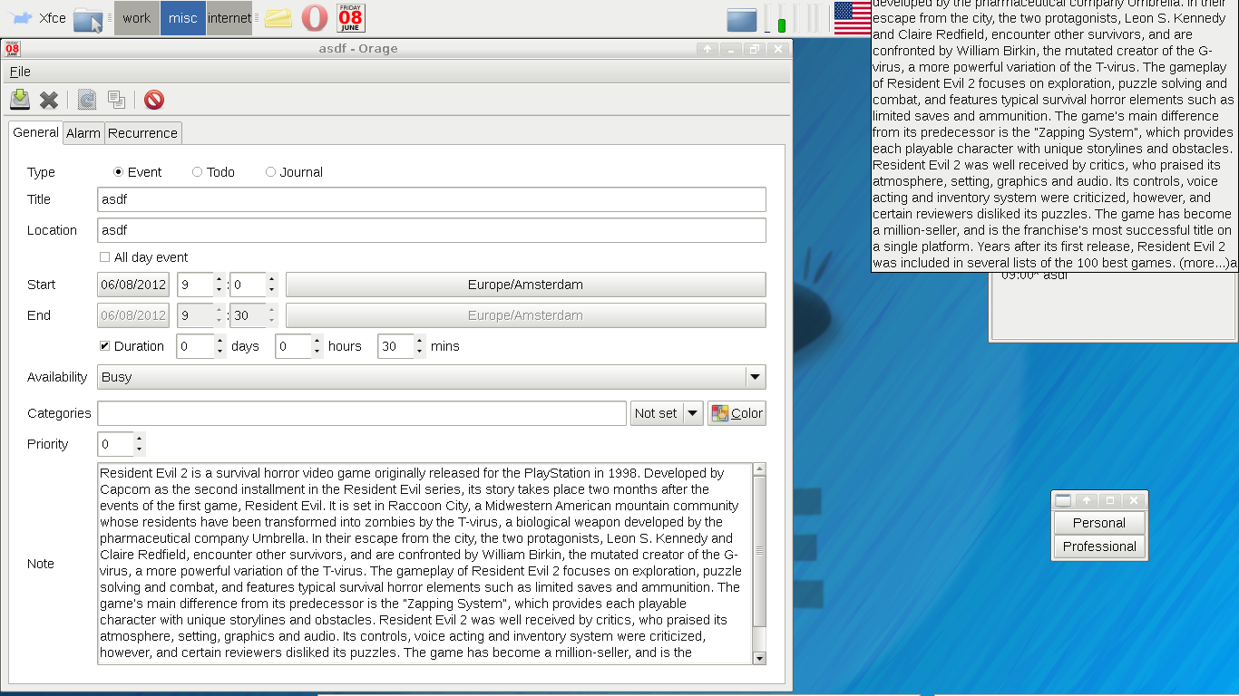 I now tested this fix but I must admit that the user experience is now worse than before. The trouble is that I often put in notes some text that I copy paste from an email (very often such text comes with no line breaks). And the 50char limit loses the utility of the tooltip. Try to make a test even with hte following text in it: "Outsized tooltip. Sometimes/often I need to add in the Note field text spanning on multiple lines. Attached is a toy example. In such cases the tooltip is completely overwhelmed and loses any practical usefulness. Can Orage do anything about this?" Now notice that you will only see "Outsized tooltip. Sometimes/often I need to add..." in the tooltip, which is not very helpful. Would there be a nicer way for Orage to deal with this?