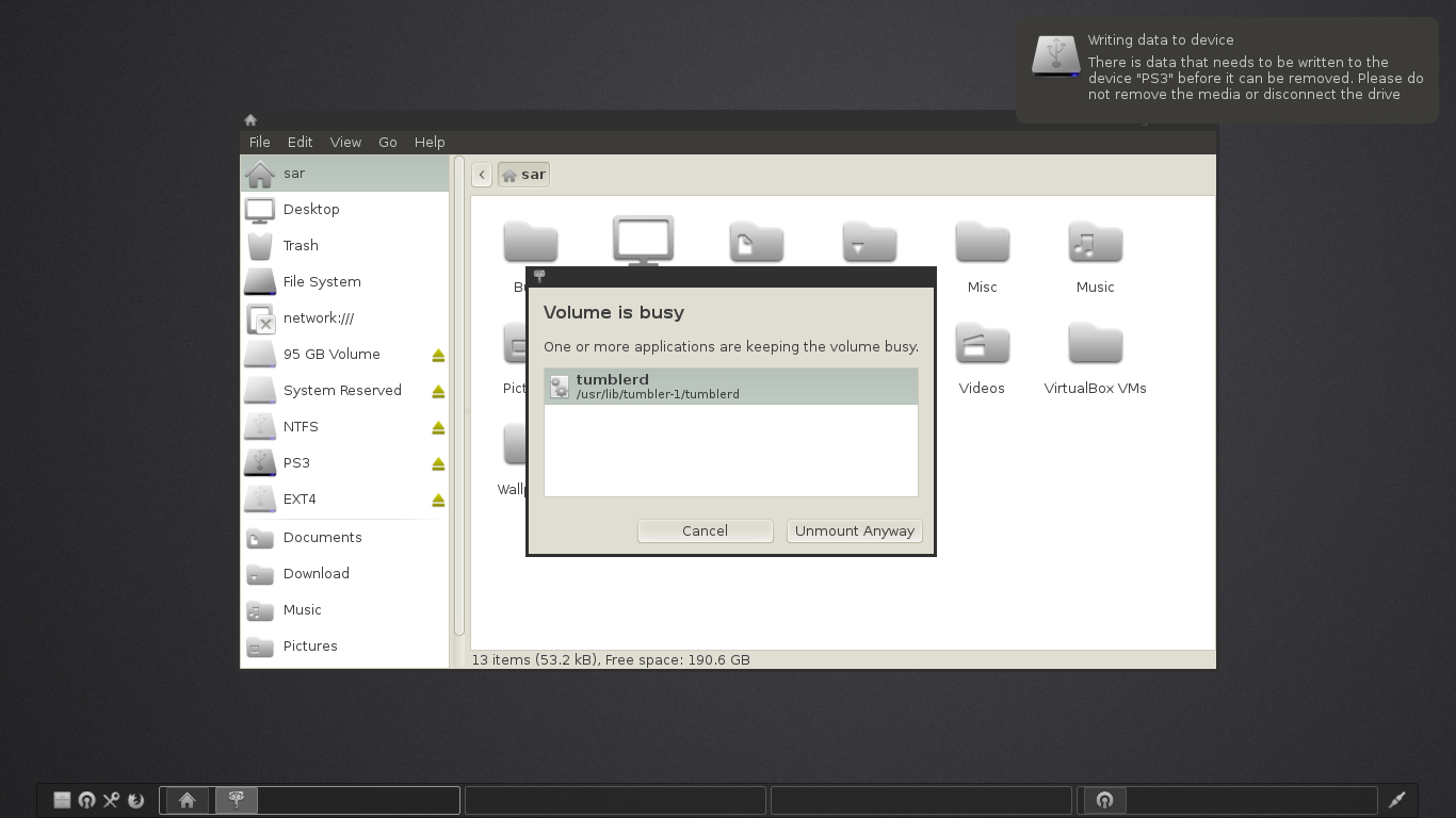 Created attachment 4658 Thunar Screen Shot I'm running Slackware 14.0 x86 with Xfce 4.10 and Thunar 1.4.0 I have two portable usb hard drives, both with 3 partitions on them, ntfs, ext4, fat32. I constantly have problems with Thunar not wanting to unmount the fat32 partition on both of these drives after I have copied something to them. When I try to click the unmount arrow in Thunar I'll always receive a popup window and a NotifyOSD popup. I'm attaching a screen shot so you can see these. Even though the NotifyOSD says it's writing data there isn't any data that needs to be written to it, I can have the drives sit for 10 minutes after I've copied something to them as an example and it will still complain. It doesn't matter how long I wait it still complains that it's writing data. I don't have any problems at all with the ntfs or ext4 partitions. It seems like Thunar just doesn't like working with FAT32 and I hope this can be fixed, as soon as possible, because I noticed in Windows when I run chkdisk on the partitions Windows is finding errors it needs to fix and the hard drives do not have any problems with them, Thunar is creating file system problems... I plugged in and removed my hard drive a few times to test this, and this is all that was listed in /var/log/messages; Oct 10 21:16:29 slack udisksd[2017]: Cleaning up mount point /run/media/sar/PS3 (device 8:33 is not mounted) Oct 10 21:16:29 slack udisksd[2017]: Unmounted /dev/sdc1 on behalf of uid 1000 Oct 10 21:16:35 slack kernel: usb 2-1.1: USB disconnect, device number 4 Oct 10 21:17:14 slack kernel: usb 2-1.1: new high-speed USB device number 5 using ehci_hcd Oct 10 21:17:14 slack kernel: usb 2-1.1: New USB device found, idVendor=152d, idProduct=2329 Oct 10 21:17:14 slack kernel: usb 2-1.1: New USB device strings: Mfr=1, Product=11, SerialNumber=3 Oct 10 21:17:14 slack kernel: usb 2-1.1: Product: USB Mass Storage Oct 10 21:17:14 slack kernel: usb 2-1.1: Manufacturer: JMicron Oct 10 21:17:14 slack kernel: usb 2-1.1: SerialNumber: 0000000000012A Oct 10 21:17:14 slack kernel: scsi8 : usb-storage 2-1.1:1.0 Oct 10 21:17:14 slack mtp-probe: checking bus 2, device 5: "/sys/devices/pci0000:00/0000:00:1d.0/usb2/2-1/2-1.1" Oct 10 21:17:14 slack mtp-probe: bus: 2, device: 5 was not an MTP device Oct 10 21:17:16 slack kernel: scsi 8:0:0:0: Direct-Access IOCELL Turbo Hard Disk PQ: 0 ANSI: 2 CCS Oct 10 21:17:16 slack kernel: sd 8:0:0:0: [sdd] 312581808 512-byte logical blocks: (160 GB/149 GiB) Oct 10 21:17:16 slack kernel: sd 8:0:0:0: [sdd] Write Protect is off Oct 10 21:17:16 slack kernel: sdd: sdd1 sdd2 sdd3 Oct 10 21:17:16 slack kernel: sd 8:0:0:0: [sdd] Attached SCSI disk Oct 10 21:17:26 slack udisksd[2017]: Mounted /dev/sdd1 at /run/media/sar/PS3 on behalf of uid 1000 Oct 10 21:17:46 slack udisksd[2017]: Cleaning up mount point /run/media/sar/PS3 (device 8:49 is not mounted) Oct 10 21:17:46 slack udisksd[2017]: Unmounted /dev/sdd1 on behalf of uid 1000 Oct 10 21:17:50 slack udisksd[2017]: Mounted /dev/sdd1 at /run/media/sar/PS3 on behalf of uid 1000 Oct 10 21:17:54 slack udisksd[2017]: Cleaning up mount point /run/media/sar/PS3 (device 8:49 is not mounted) Oct 10 21:17:54 slack udisksd[2017]: Unmounted /dev/sdd1 on behalf of uid 1000 Oct 10 21:17:59 slack udisksd[2017]: Mounted /dev/sdd1 at /run/media/sar/PS3 on behalf of uid 1000 Oct 10 21:18:08 slack udisksd[2017]: Cleaning up mount point /run/media/sar/PS3 (device 8:49 is not mounted) Oct 10 21:18:08 slack udisksd[2017]: Unmounted /dev/sdd1 on behalf of uid 1000 THANKS