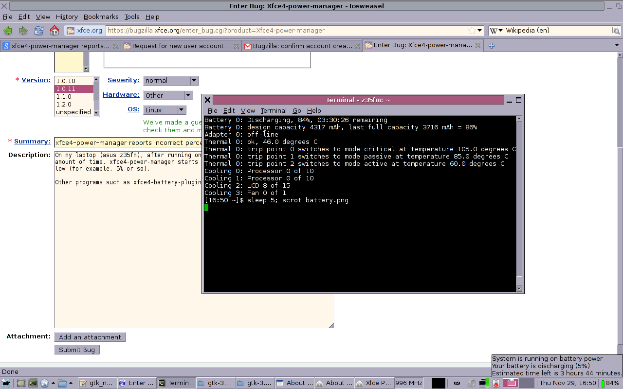 Created attachment 4768 Screenshot showing the problem On my laptop (asus z35fm), after running on battery power for a non certain amount of time, xfce4-power-manager suddenly starts reporting the battery as being very low (for example, 5% or so). Other programs such as xfce4-battery-plugin and "acpi -V" report the correct percentage.