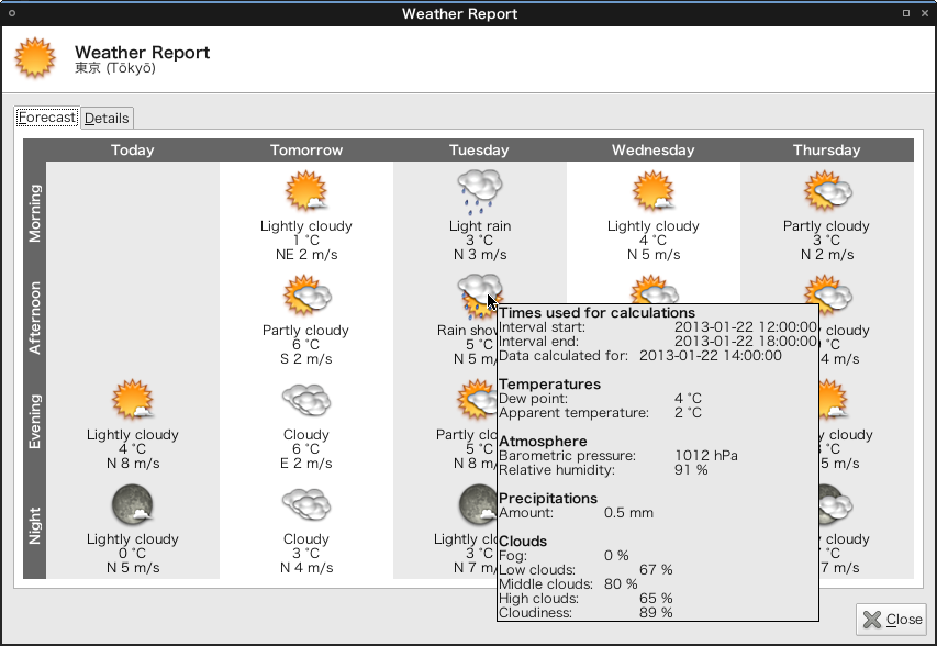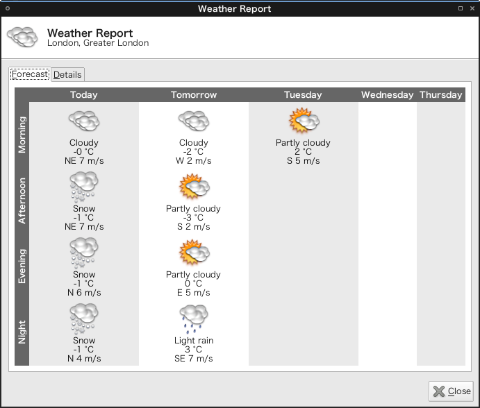 Even though forecast days is set over 4 days, forecasts are reported only up to 3 days in Forecast tab of Weather Report window. Build & Platform: Build 2013-01-19 on Arch Linux
